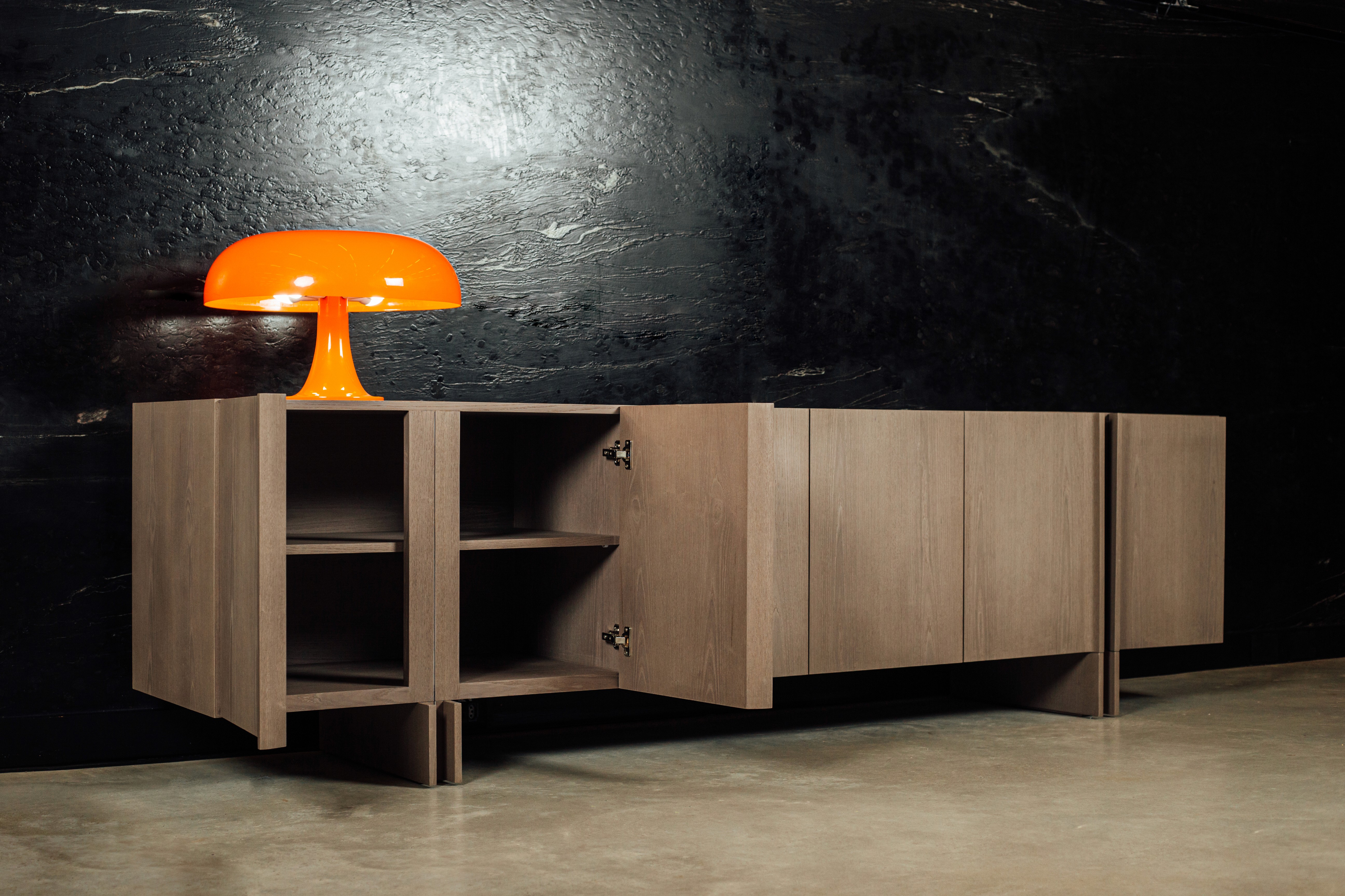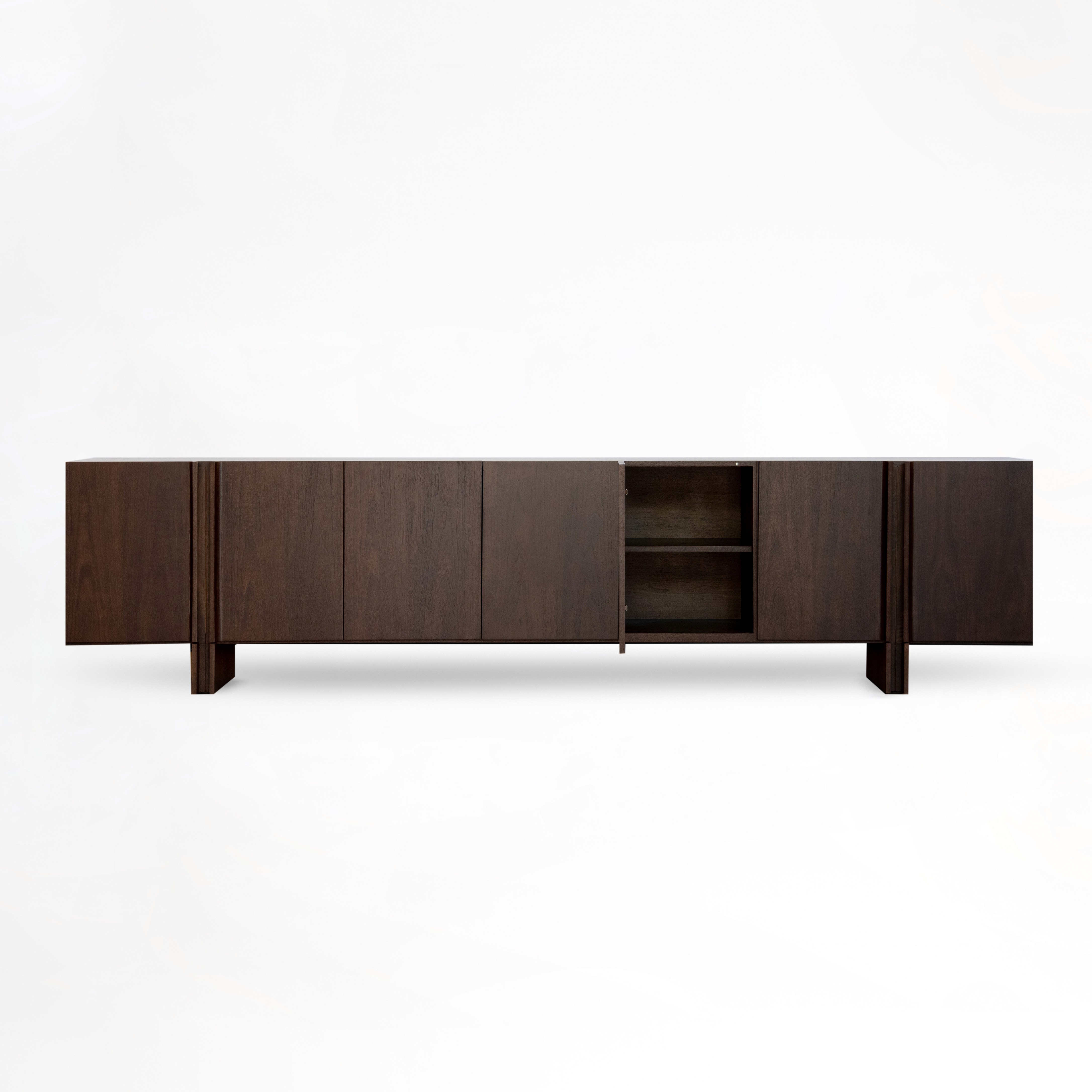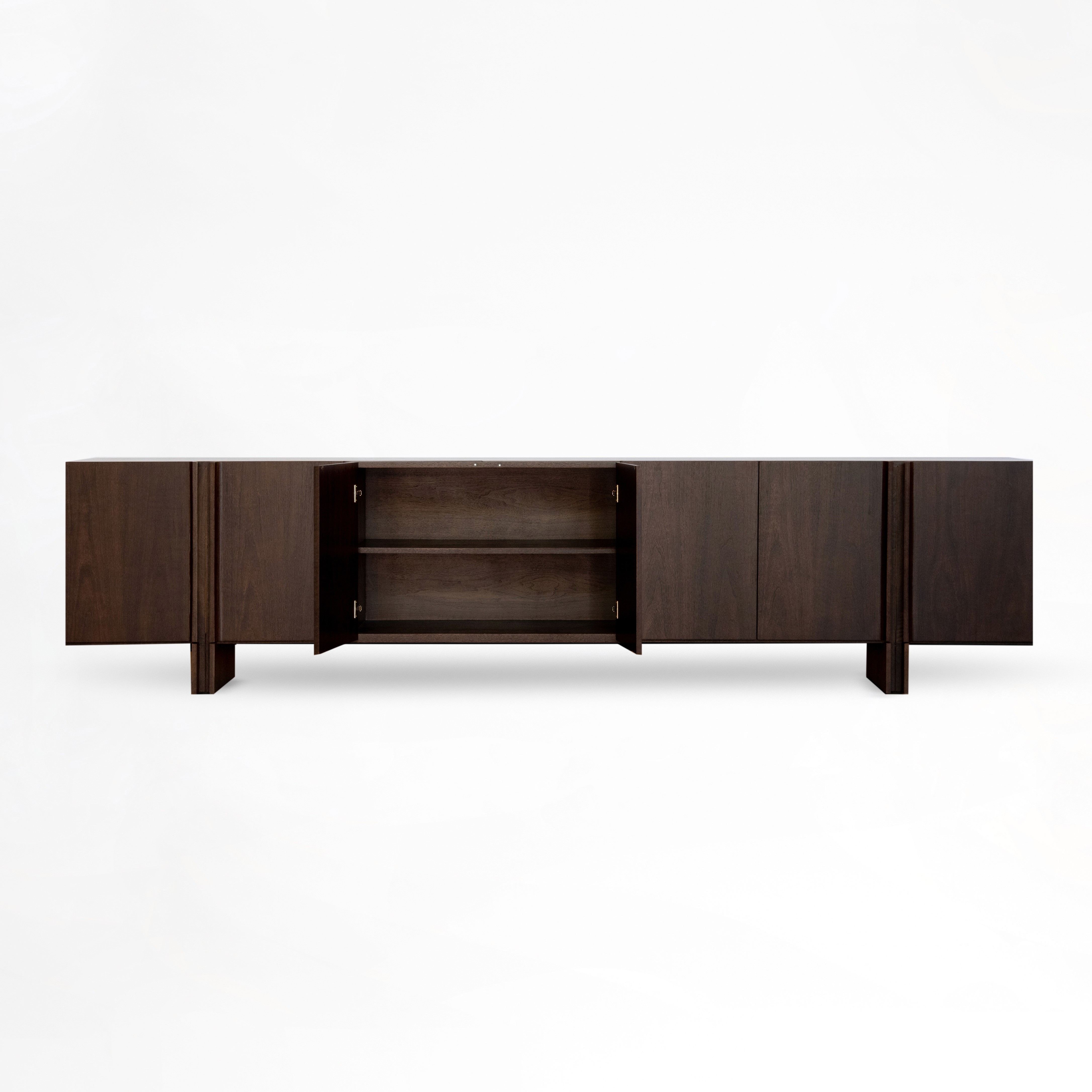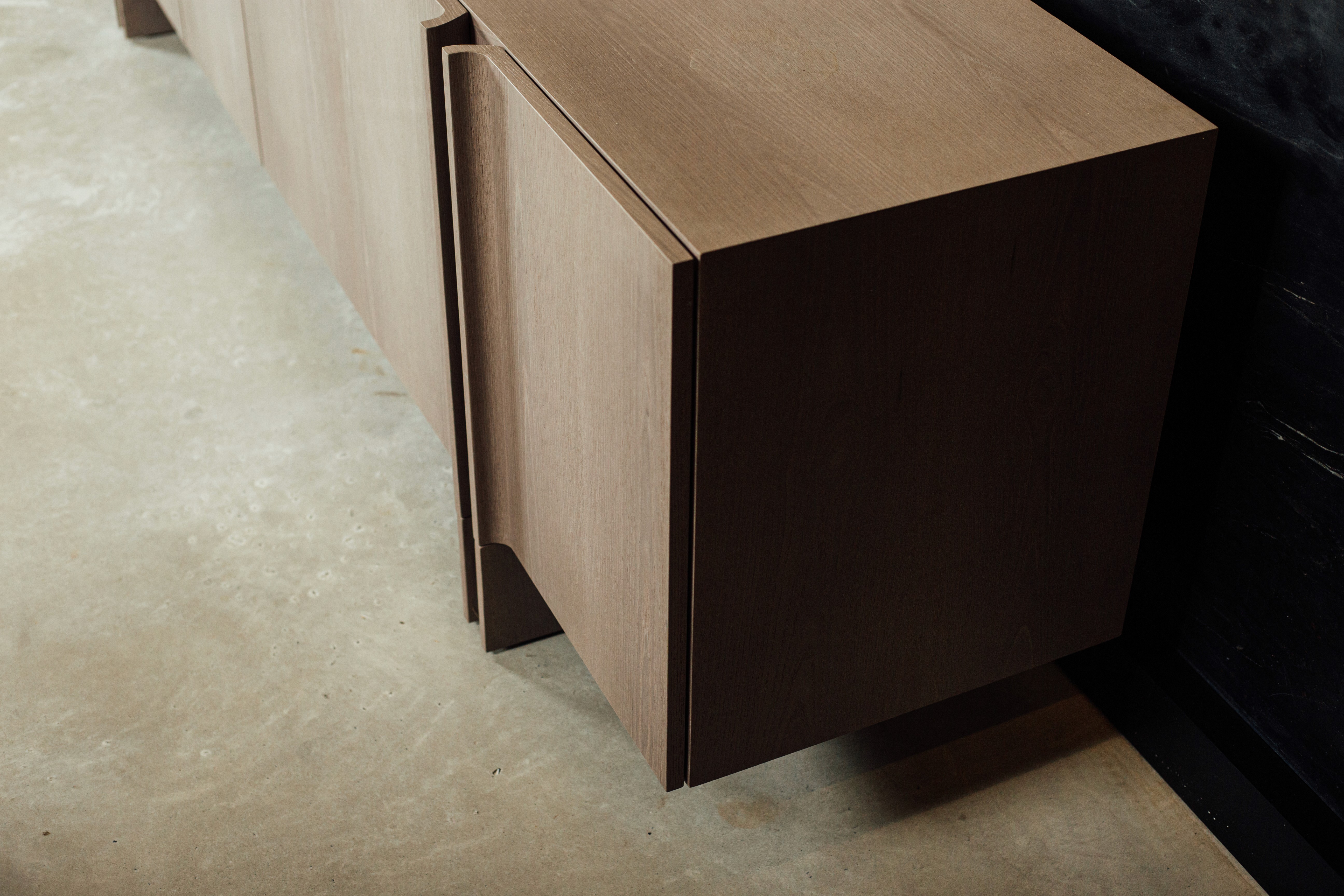 O Buffet Canela destaca-se pelo seu design minimalista, com puxadores que refletem as curvas da canela.