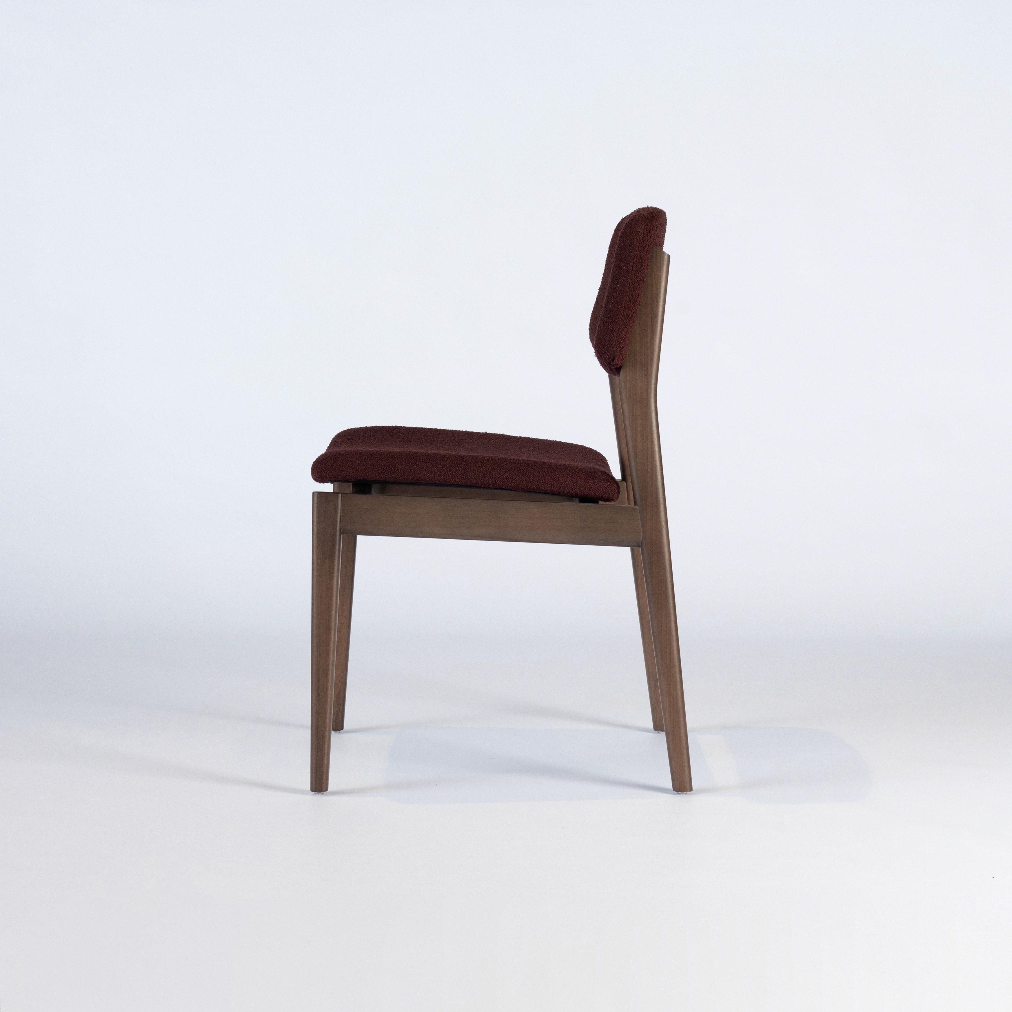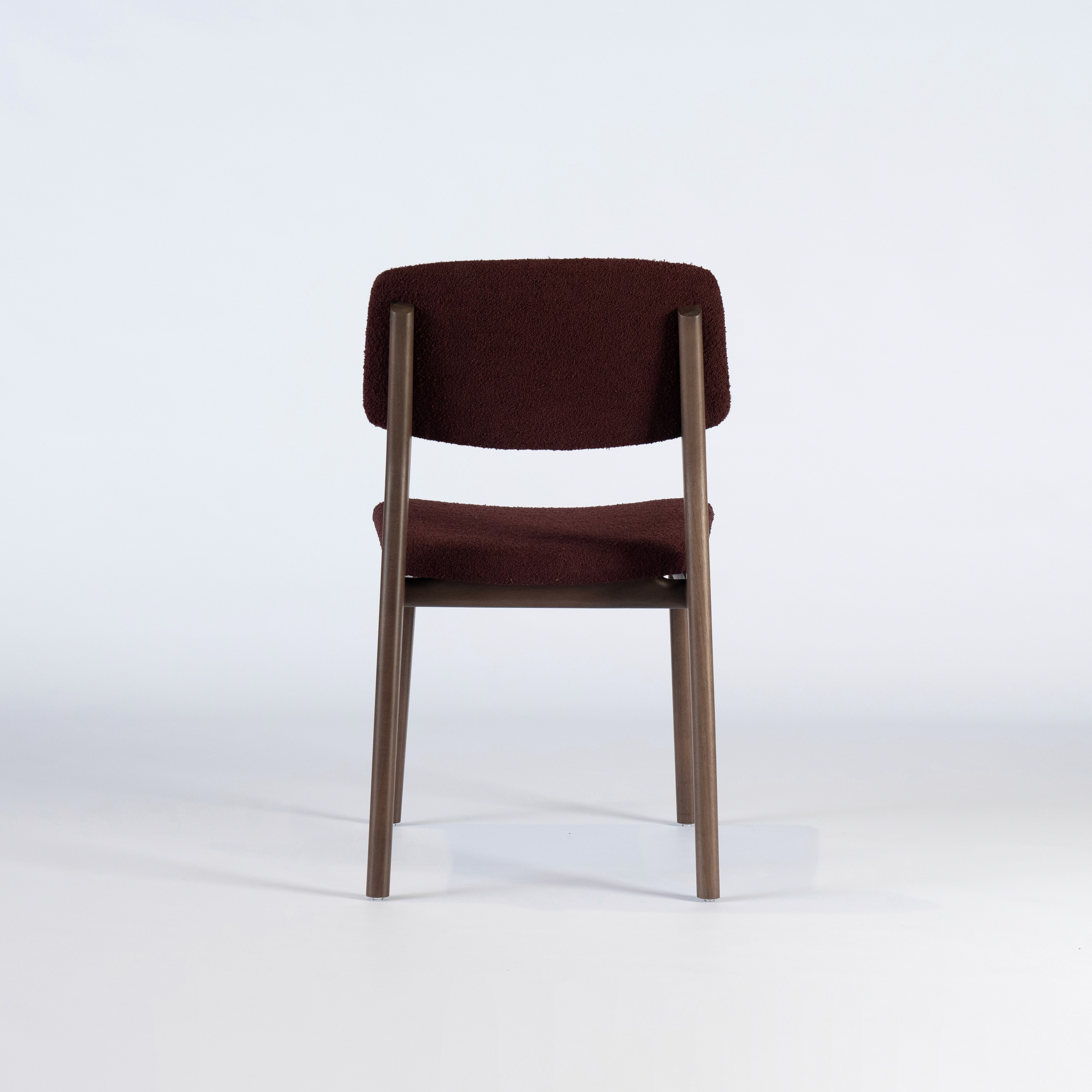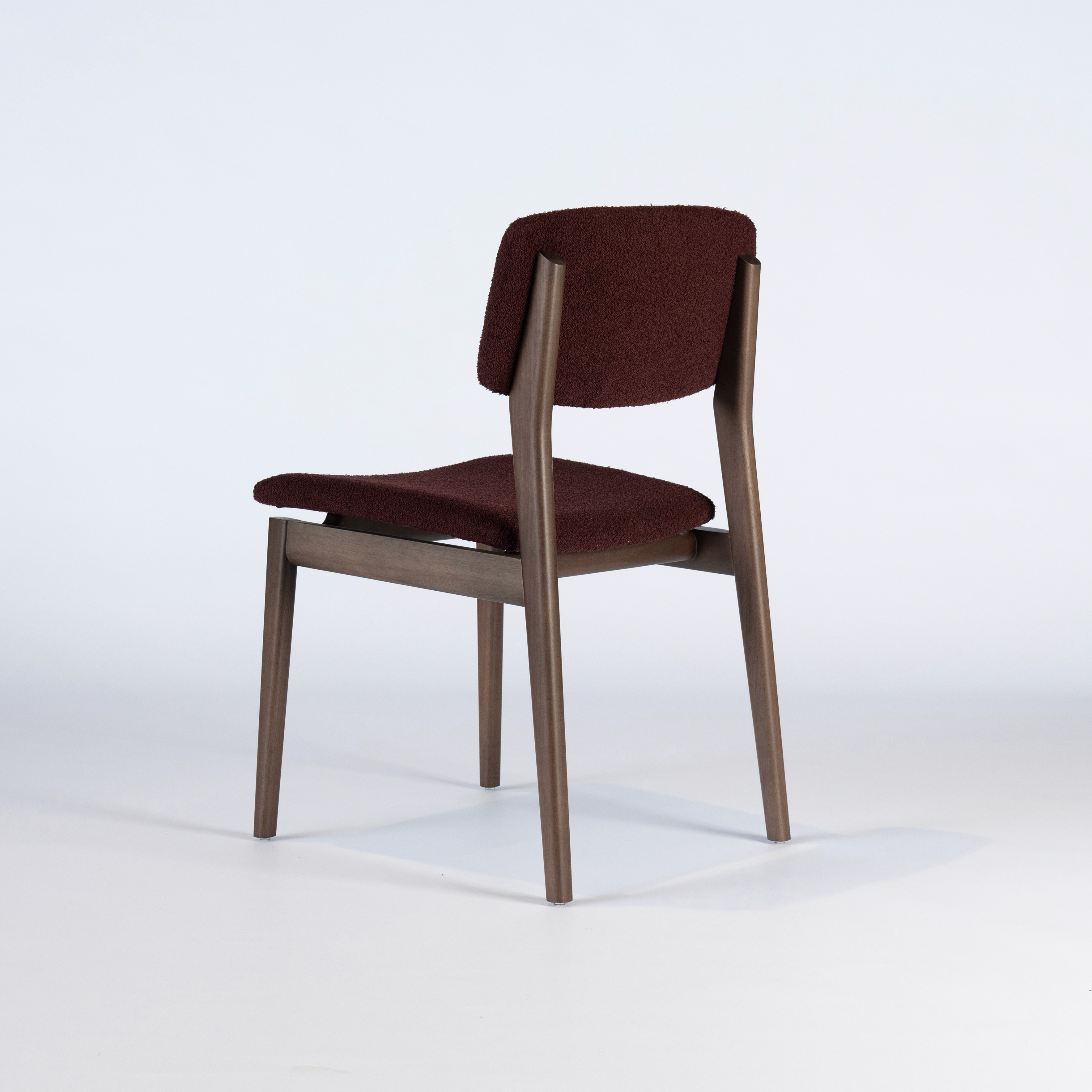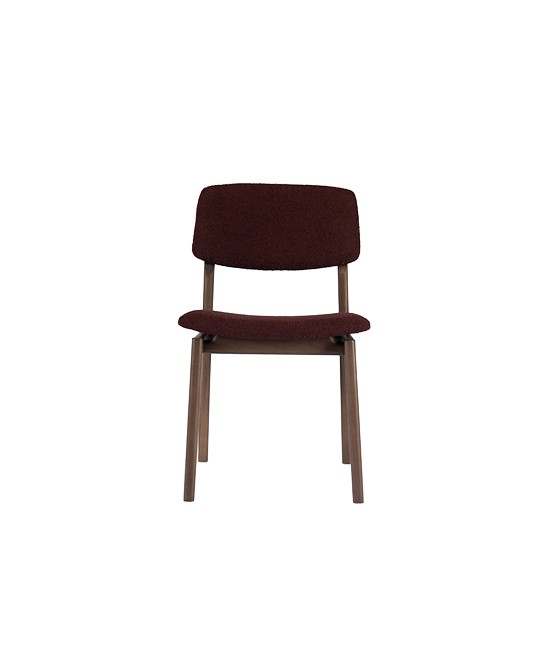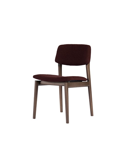 A cadeira parte de um desenho essencial, com estrutura em madeira maciça e assento e encosto estofados de proporção equilibrada.