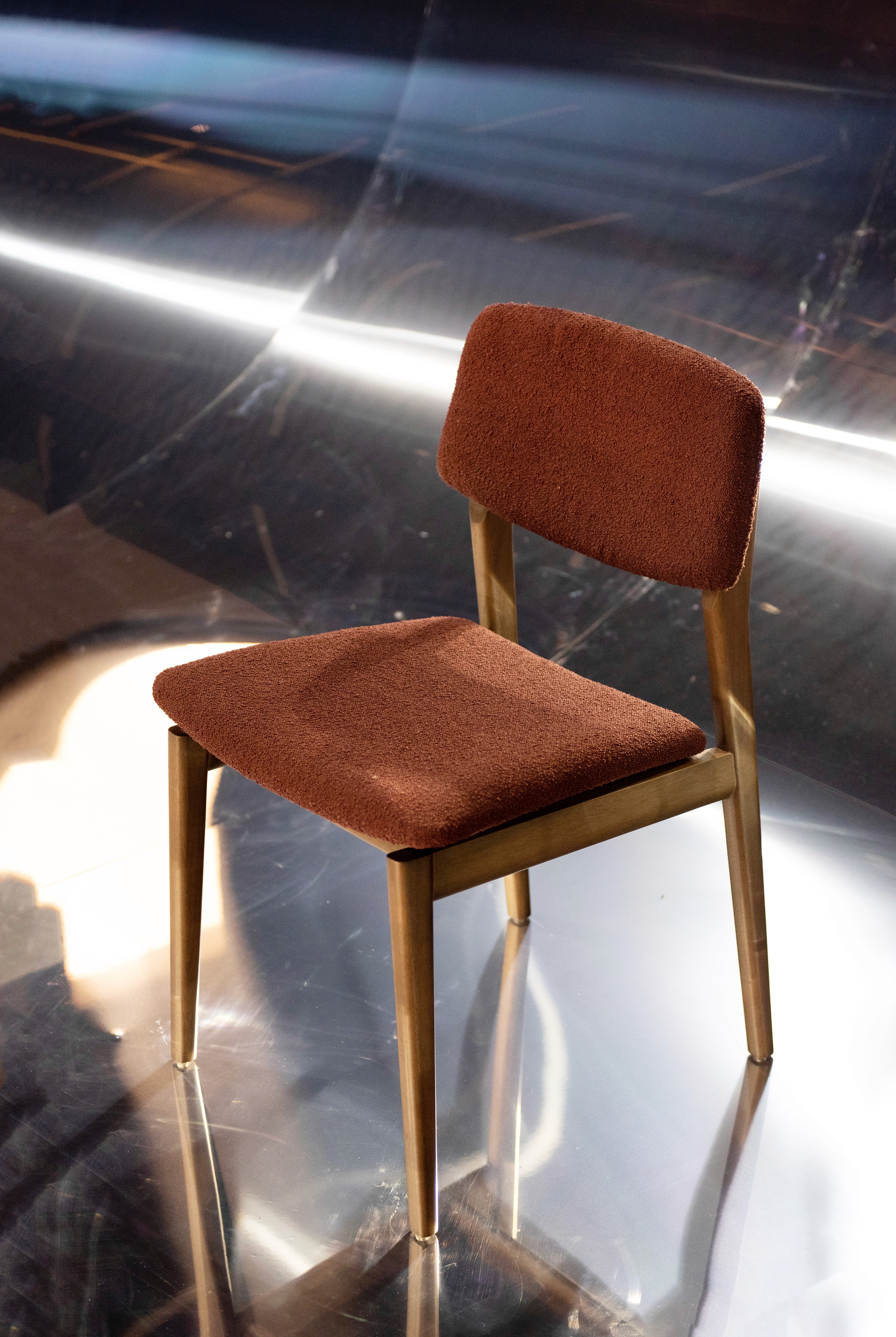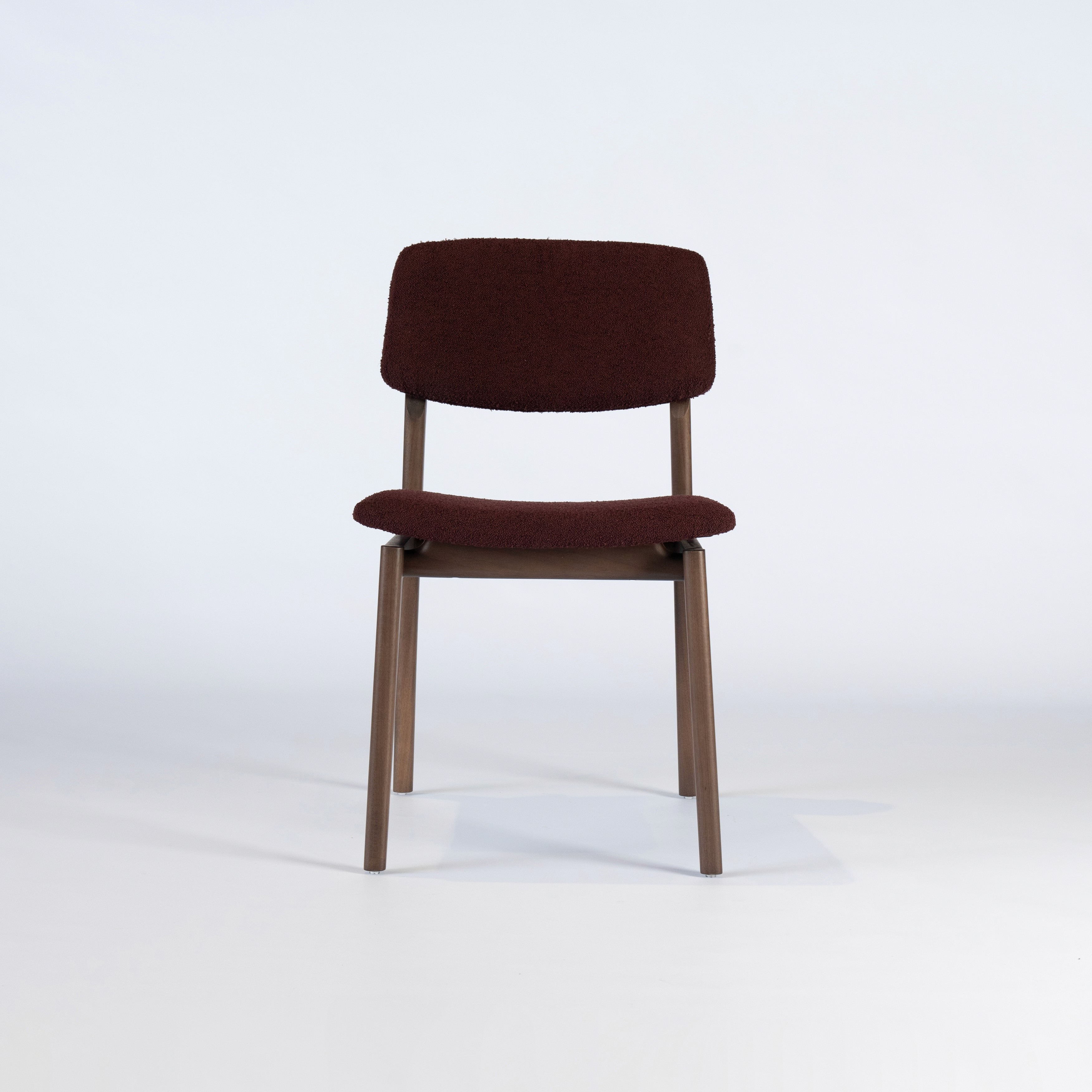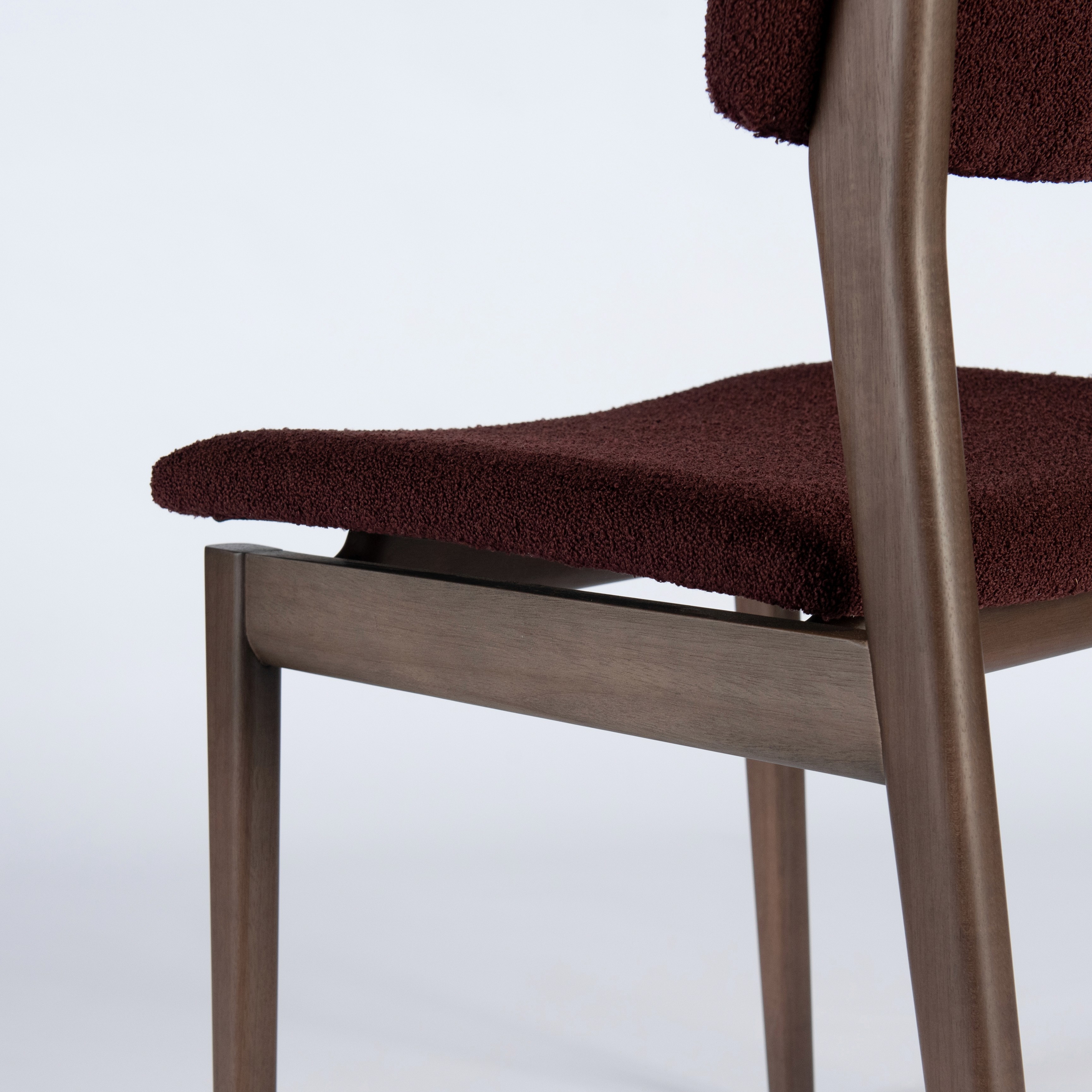 A cadeira parte de um desenho essencial, com estrutura em madeira maciça e assento e encosto estofados de proporção equilibrada.