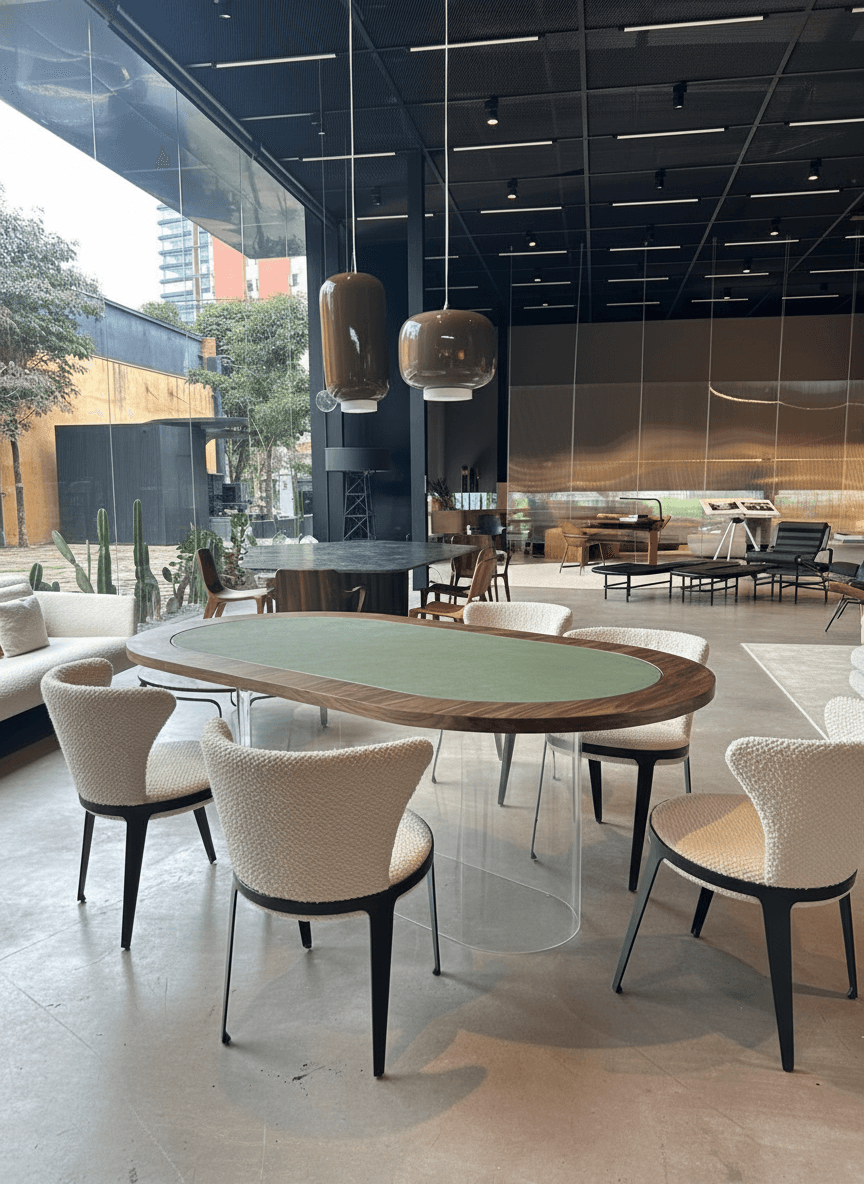 A Mesa Poker Monte Carlo foi inspirada no famoso cassino europeu. Sua base em acrílico transparente cria a sensação de que o tampo está flutuando. A peça conta com superfície reversível, com um lado em madeira e outro em couro, ideal para refeições ou jogos. No centro, há um compartimento para armazenar cartas e fichas de forma prática. Está disponível nos formatos redondo e oblongo.